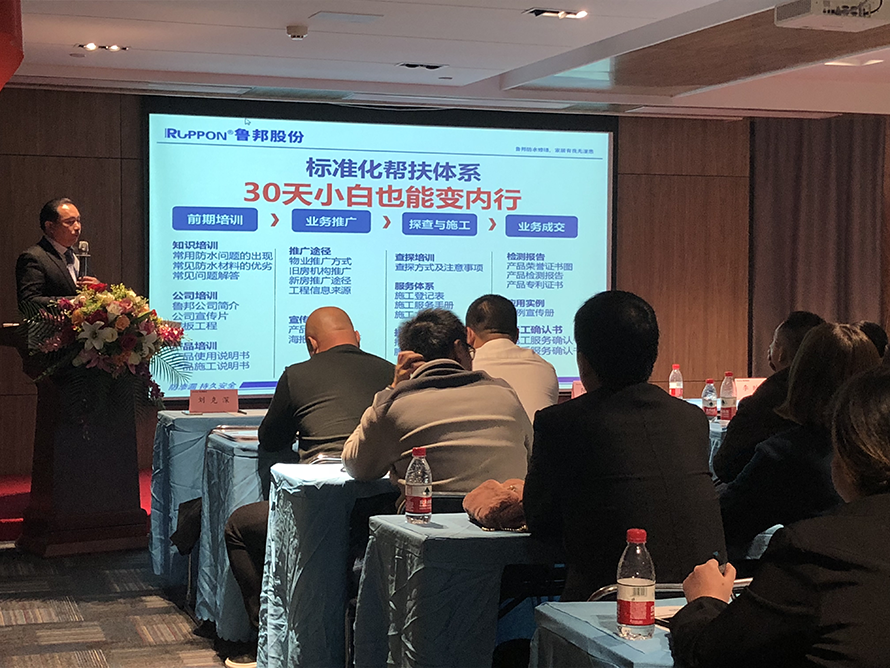 常務(wù)副總陳飛用了近90分鐘為大家全面而深刻的解析了防水修繕市場(chǎng)的背景、現(xiàn)狀和市場(chǎng)機(jī)遇,且就當(dāng)前的舊建筑物防水修繕闡明了我們的“三化”服務(wù)模式——產(chǎn)品專業(yè)化、施工標(biāo)準(zhǔn)化、售后保障化。報(bào)告了魯邦防水修繕服務(wù)中心三年的發(fā)展規(guī)劃,涵蓋技術(shù)研發(fā)、市場(chǎng)服務(wù)團(tuán)隊(duì)、施工技術(shù)團(tuán)隊(duì)及魯邦防水修繕服務(wù)中心覆蓋縣城達(dá)到1000家。