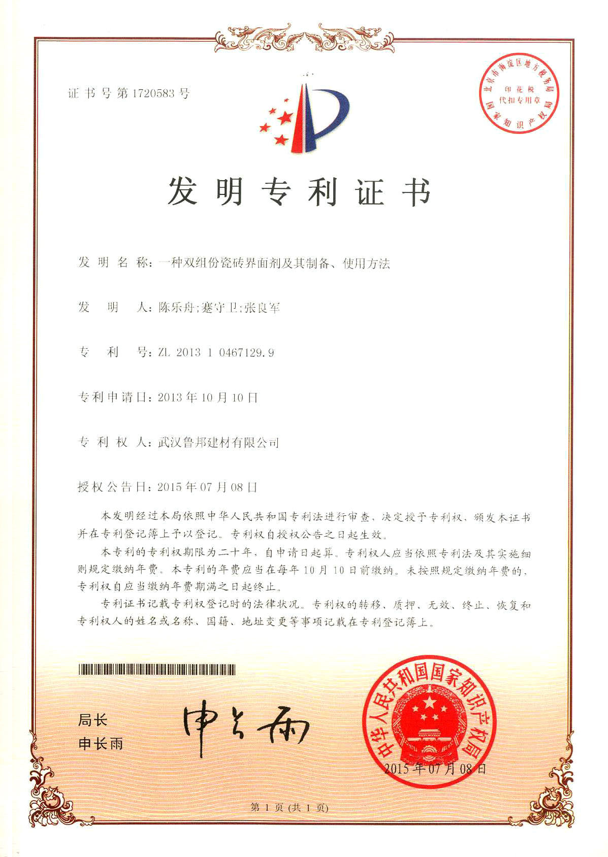 本產(chǎn)品是湖北魯邦建材股份有限公司技術(shù)研發(fā)中心開發(fā)的一種擁有國家發(fā)明專利(專利號:ZL2013104671299)的新型瓷磚粘結(jié)界面材料,由國際大品牌高分子聚合物及優(yōu)質(zhì)改性劑復(fù)合精制而成,能極大的釋放大部分?;u等高密度低吸水率磚與粘結(jié)材料之間的應(yīng)力,明顯的提高玻化磚等高密度低吸水率磚的粘結(jié)效果,不易空鼓,不易掉磚,直接解決大磚及高密度低吸水率磚粘貼難的問題。